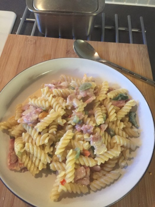 Tonight, a pasta dish but this is for the carbs. 200 ml of whole milk to help ketosis, 3 rashers of streaky bacon, red, yellow and green peppers and salt and pepper to taste. It’s a bit of a celebration of the finding that we are healthier eating the right kind of fats, but i’m pretty sure if I don’t get exercising properly soon my Doc might disagree.